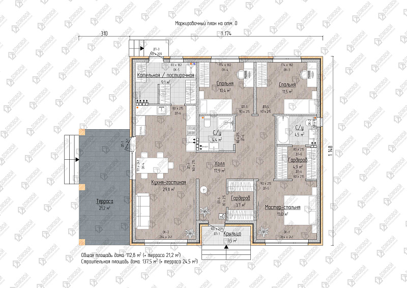 - Строительная площадь: 137.5 м²